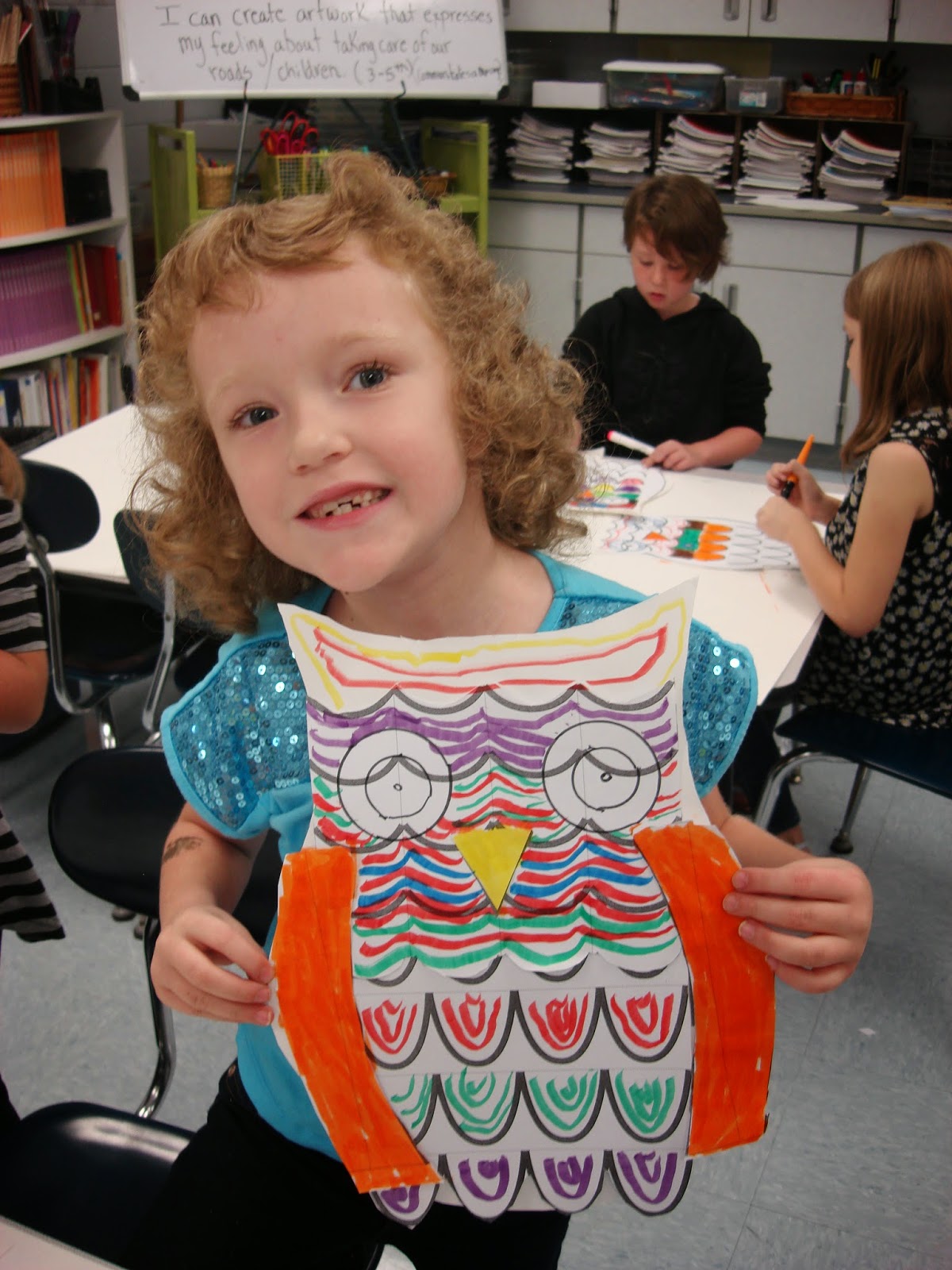 In Kindergarten through 2nd grade they will be reviewing line designs and practicing their cutting skills by creating an owl. Below are some of the students are work creating their owls and working on their posters.